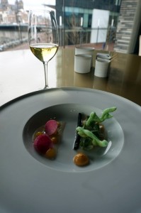 Amuse bouche olarak bademli milföy hamuru içerisinde limon kabuğu,hindistan cevizi ve yengeç etinden oluşan bir mini kanepe sunuyorlar. Yengeç eti ile lime gerçekten çok yakışıyor. Üstelik karides cipsi yerine bana daha yaratıcı ve hoş gelen bademli milföy hamuru, deniz mahsulünün bademle nasıl iyi işler çıkardığını göstermesi açısından güzel bir deneyim. Yanında lime ile desteklenen yosun tozlu karides bonbon ceviche ikinci amuse bouche olarak geliyor. Karidese hafif tatlı,zarif dokunuşlar katan bu bonbon cevicheyi ısırdığınızda ağzınıza şeker akıyor. Daha sonra kaz ciğerli ekler ve çikolata sunuluyor. Ekler hamuru enfes! en iyi pastanelerde bu yumuşaklığı ve tazeliği bulmak zor. Son olarak da sizi yemeğe hazırlamak açısından damağınızı temizleyen bir küçük kokteyl ile amuse bouche merasimini noktalıyorlar. Poire Williams denen Williams armudundan yapılma Fransızların eau de vie (Hayat Suyu) dedikleri bir aperatif bu. Üstünde Hanımeligillerden Mürver bitkisinin küçük parçaları var. İnsanın değil damağını, rahatsız eden düşüncelerini de temizliyor. Size mutlu olmak için sebep sunuyor!